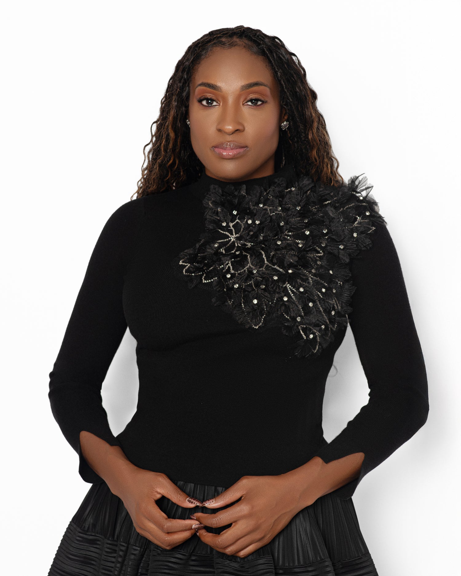 Where timeless meets trend. This sleek black top, detailed with delicate beaded accents, pairs effortlessly with skirts or trousers. A versatile piece for elevated dinners or chic day-to-night transitions.