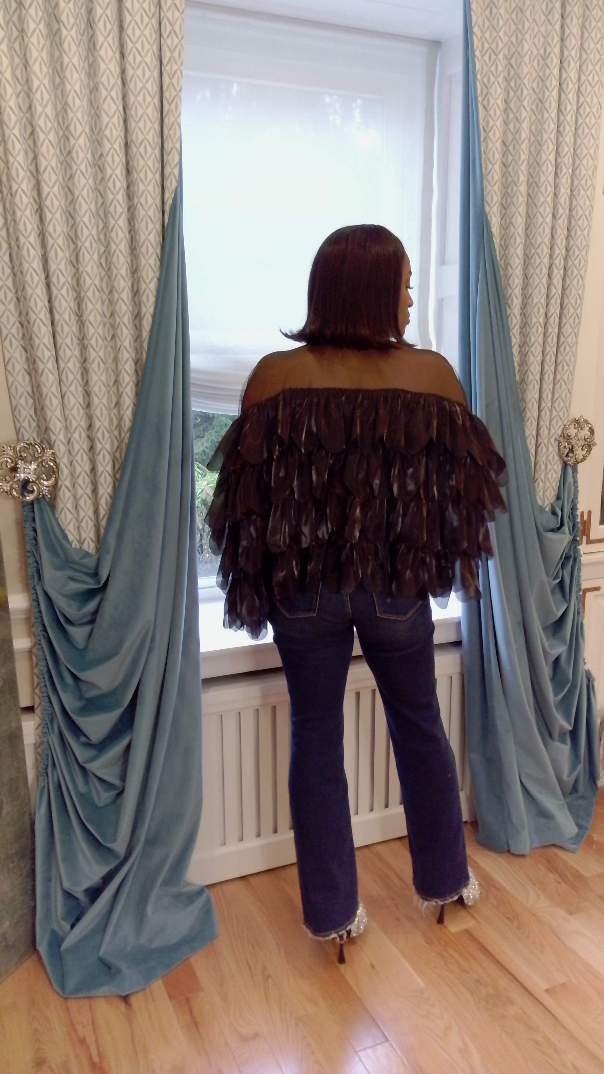 Black Shimmer Organza Scallop Ruffle Layered Blouse