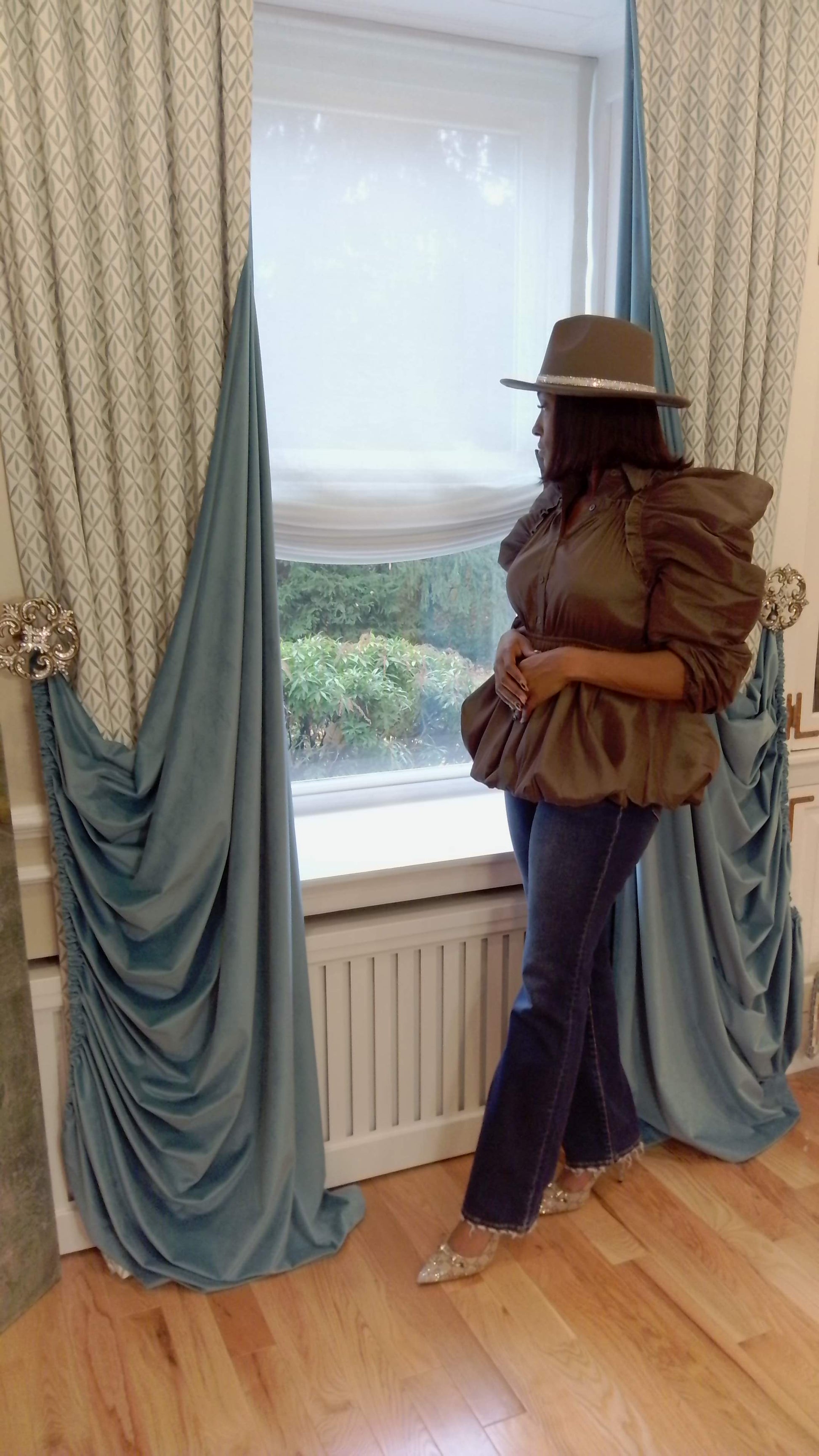Olive Balloon Shoulder Button Blouse with Button Bottom