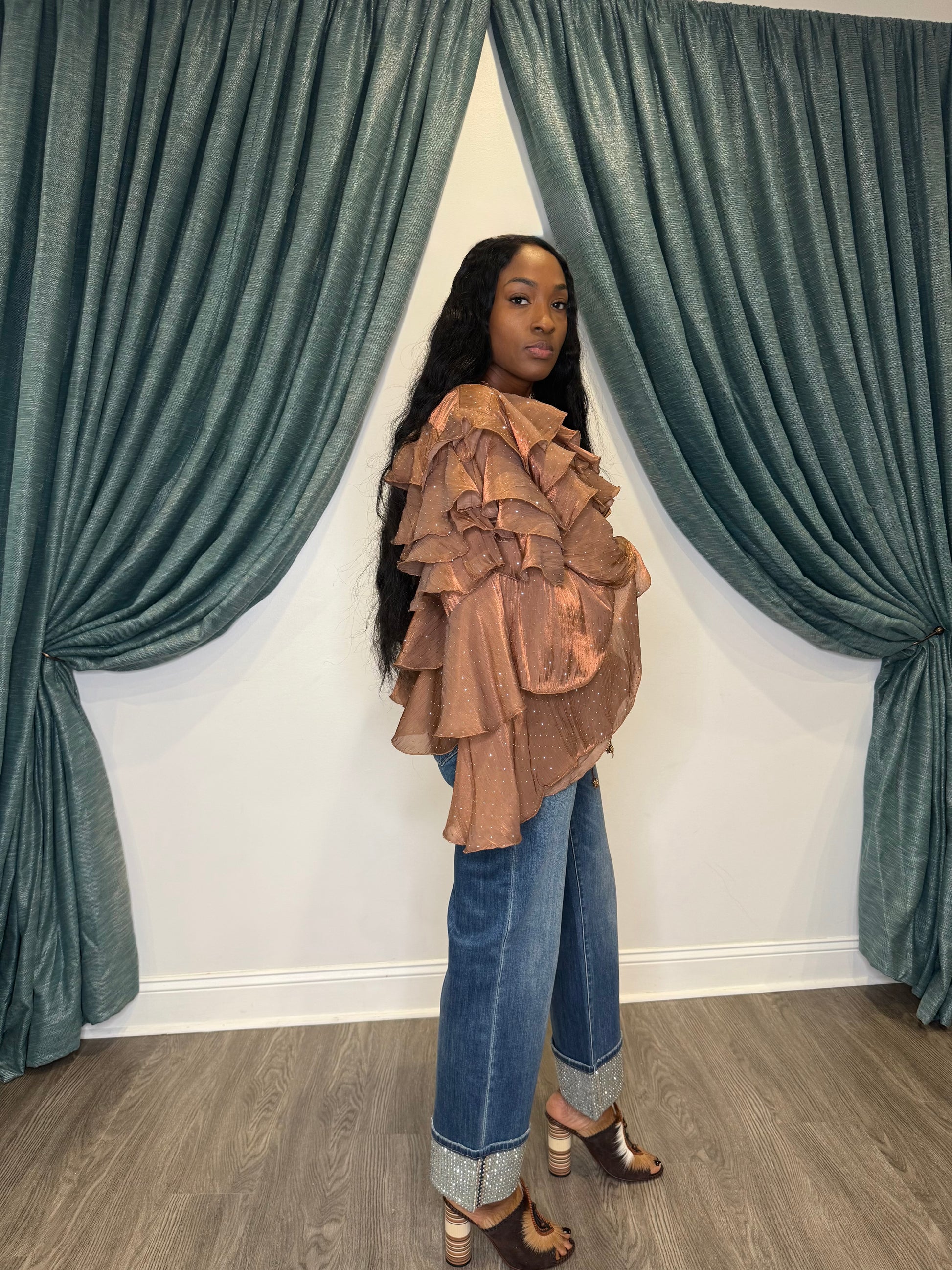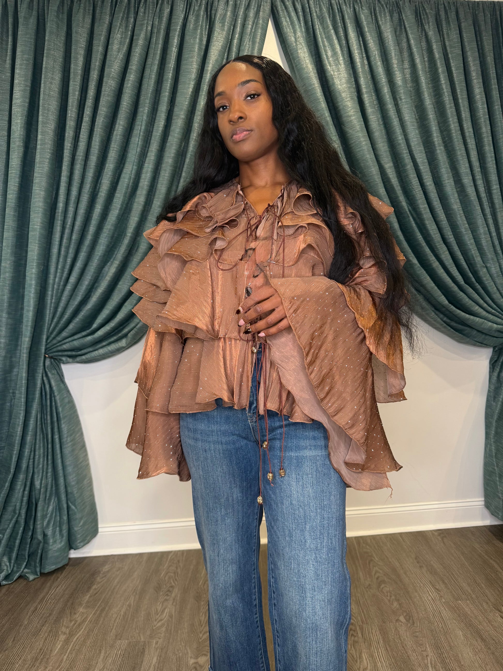 Brown chiffon top/jacket with ruffled tiers and diamonds throughout pull strings in the middle
