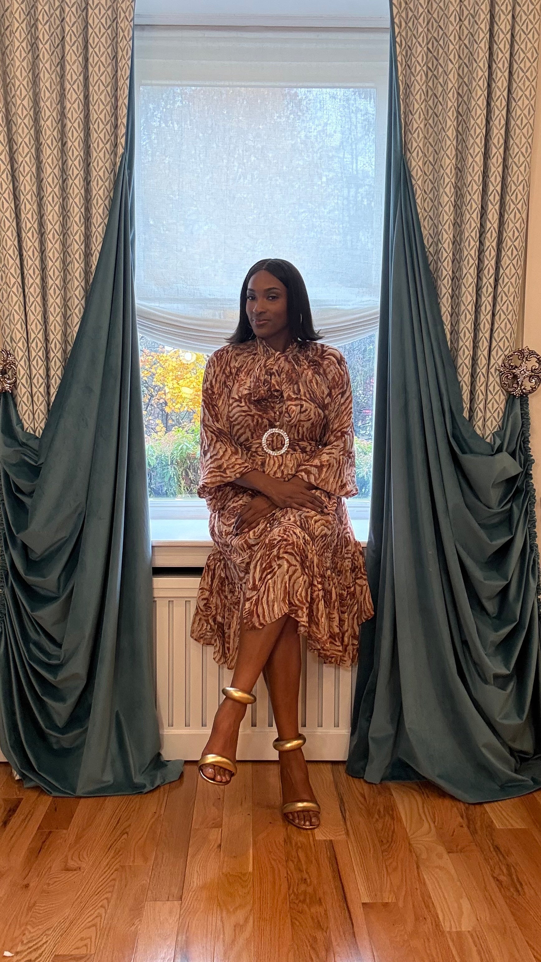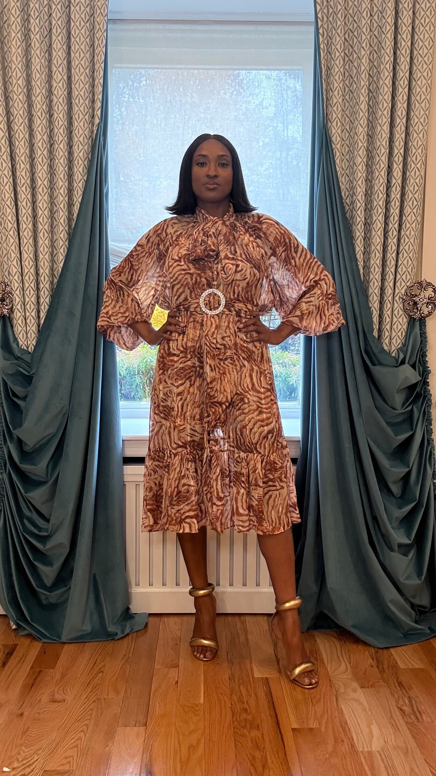 Wavy Brown Button Up Dress with matching slip dress and belt with rhinestone buckle.