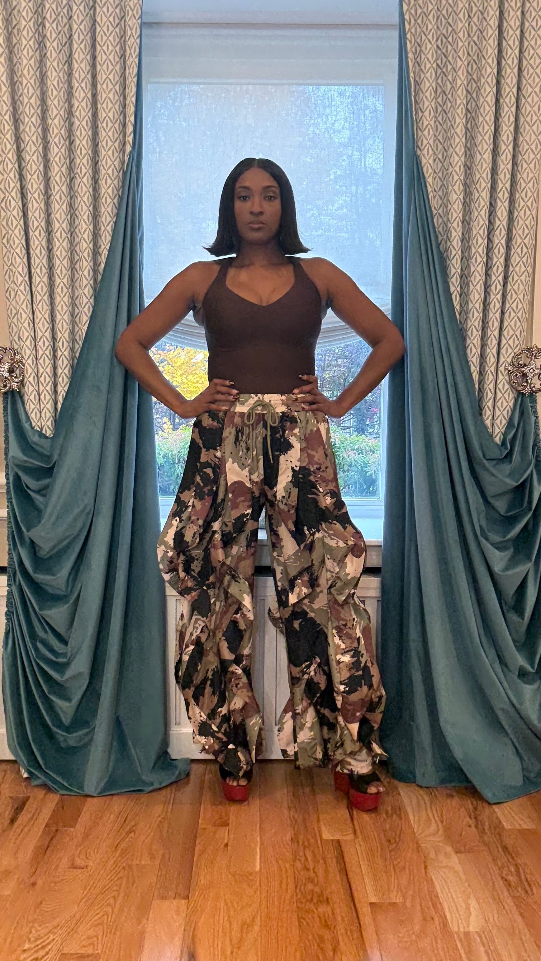 Wide leg dramatic ruffle drawstring joggers with a lighter camo print.