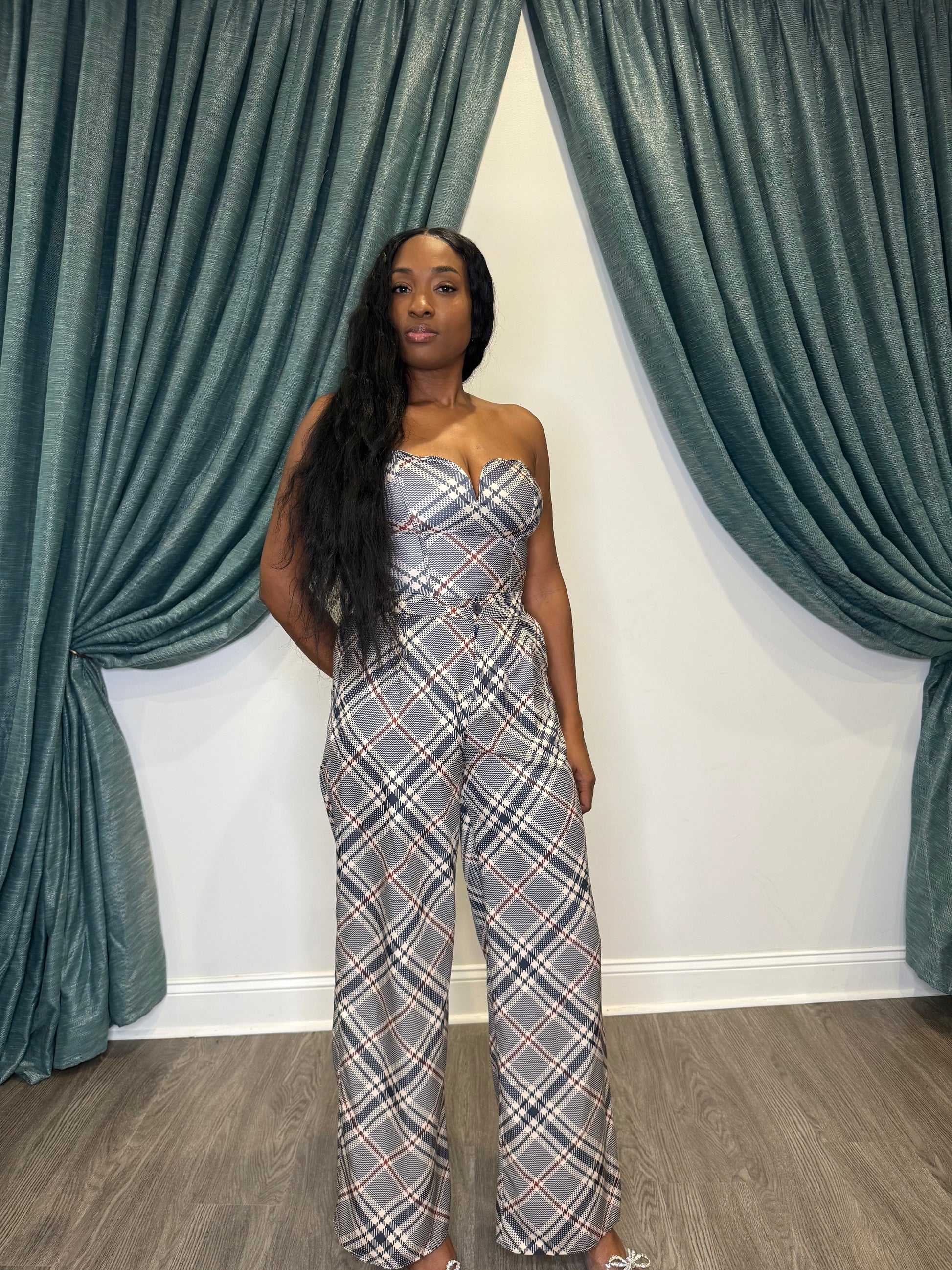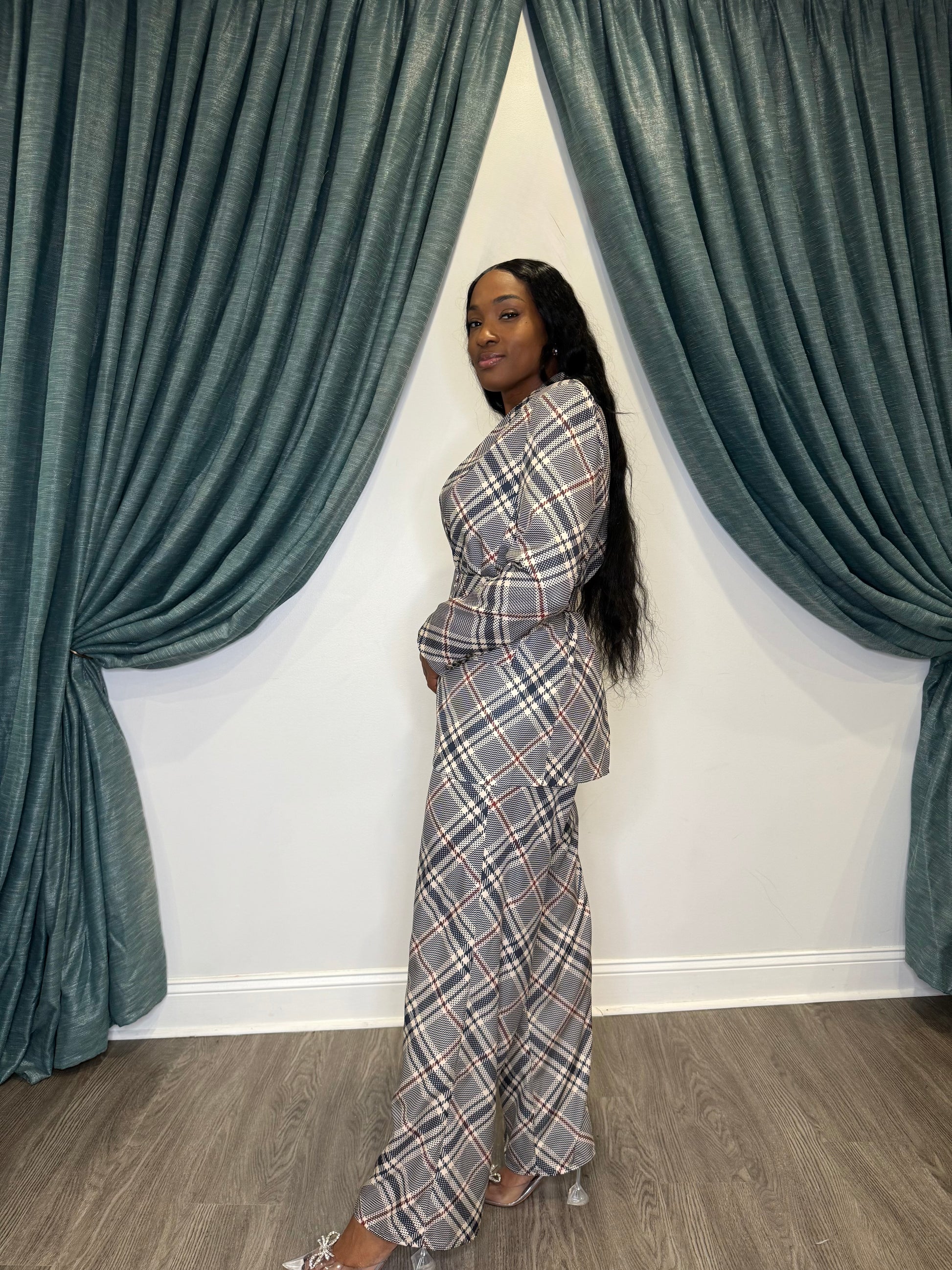 Grey plaid 3-piece set - Jacket with a belt, bustier and pants.
